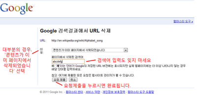 참고 - 해당 페이지가 404 오류를 표시하거나, 웹마스터가 robots.txt 파일 또는 noindex 메타태그를 사용하여 해당 페이지의 검색을 차단한 경우에 한하여 “이유”에서 “웹마스터가 이미 페이지를 차단했습니다.”를 선택할 수 있습니다. 그러나 만약 해당 페이지가 404 오류를 표시하지 않거나 검색 차단이 되고 있지 않을 경우, 이 항목을 선택하시면 삭제 요청이 거부될 수 있습니다. 대부분의 경우는 게시판에서 글을 지웠다고해서 404 오류가 표시되지는 않기 때문에 “콘텐츠가 이미 페이지에서 삭제되었습니다.”로 접수하시면 됩니다.