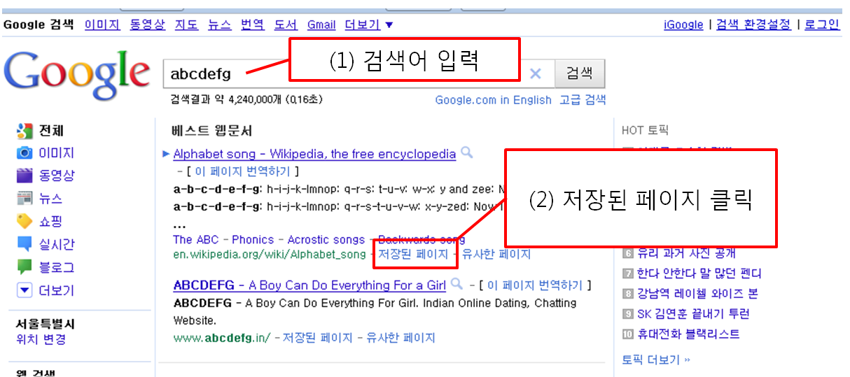 3. 검색어를 타이핑 하시고, 삭제하고자 하는 검색 결과의 ‘저장된 페이지’를 클릭합니다.